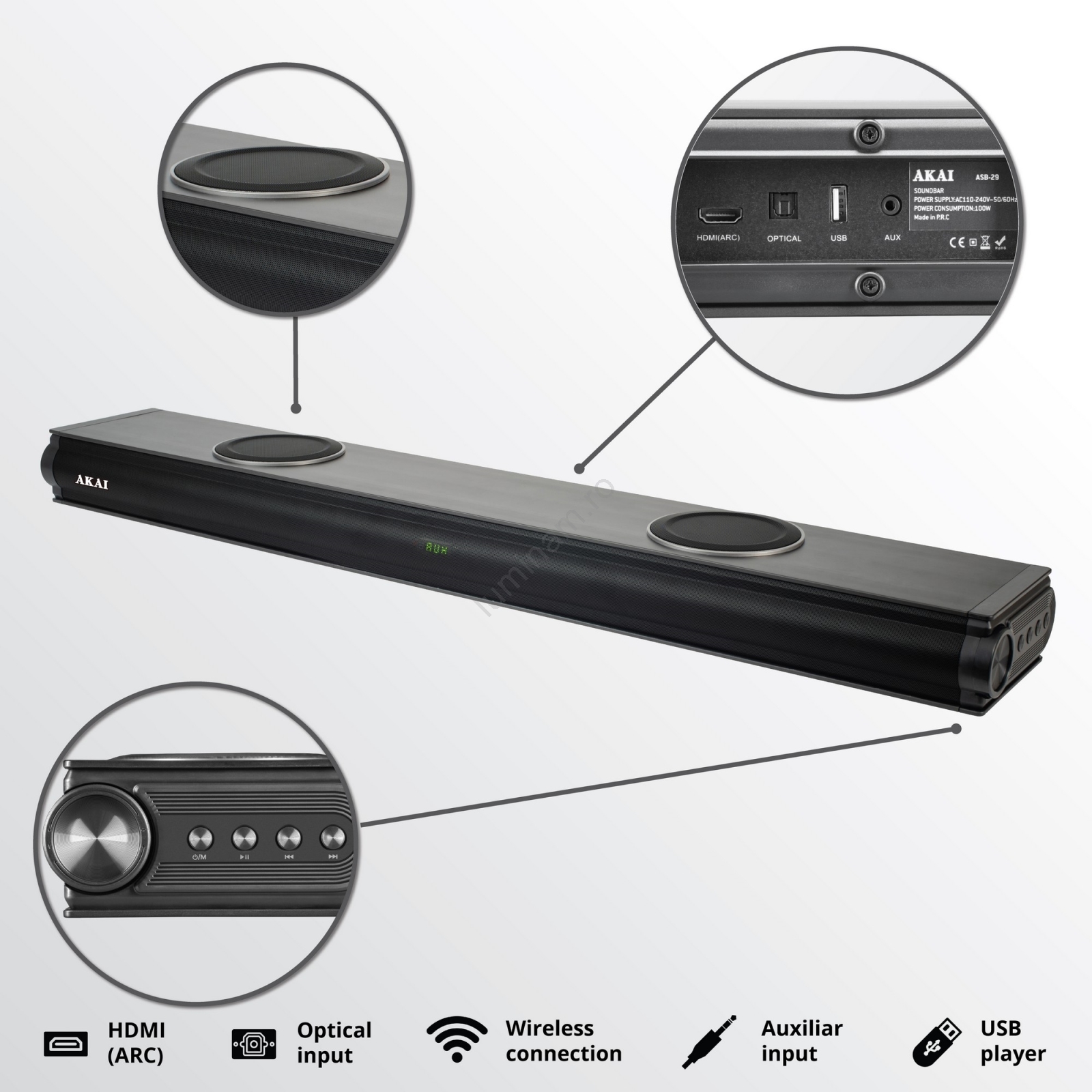 AKAI ASB-29 – soundbar cu subwoofer activ, 120 W / 230 V și telecomandă