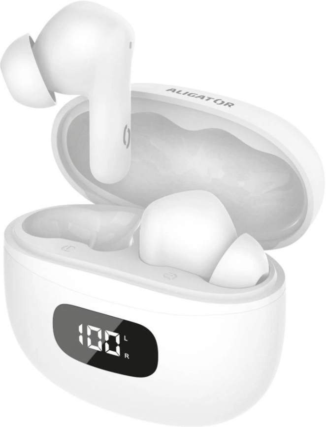 Aligator TWS08WT – Căști wireless cu ANC, 200 mAh + 2 x 30 mAh, IP40, alb