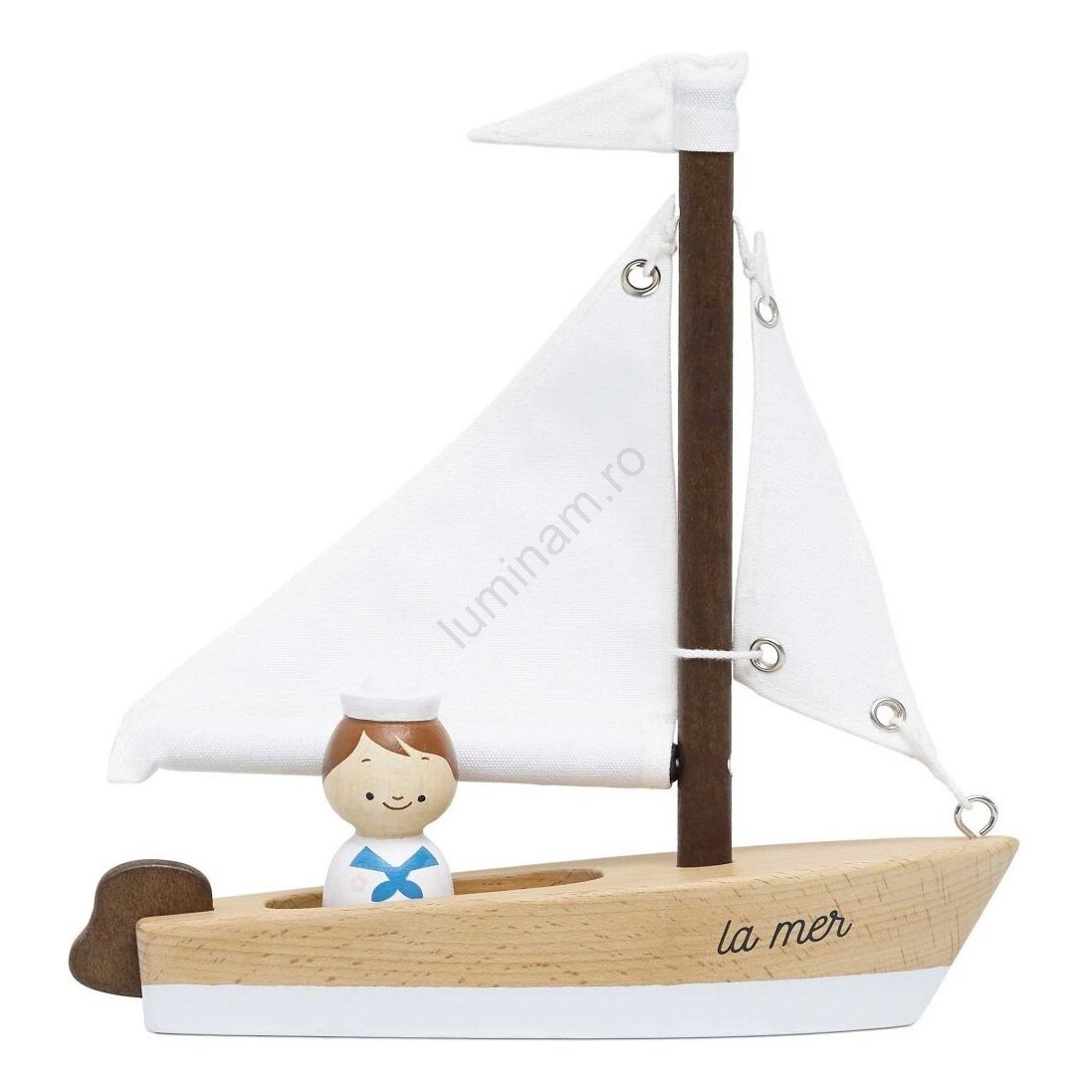 • Barca este însoțită de un marinar în miniatură din lemn care are un costum de marinar pictat manual, ceea ce face ca joaca cu această barcă cu vele să fie și mai distractivă.