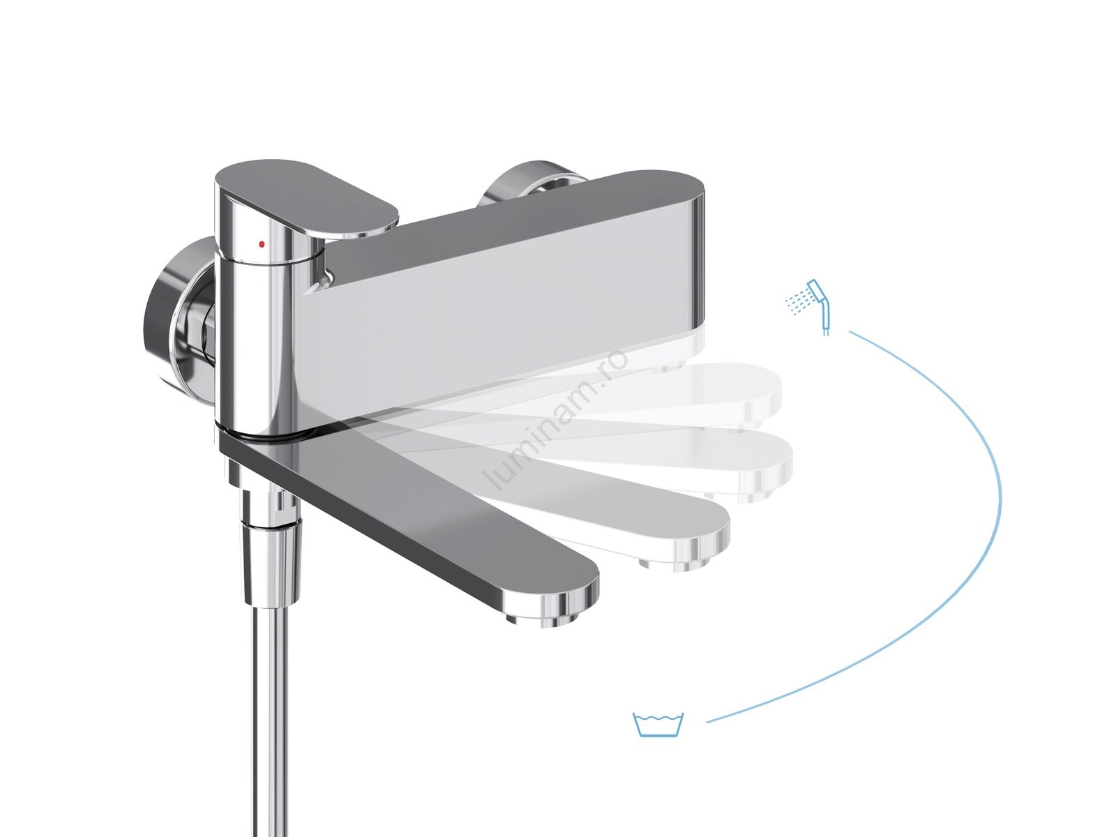 • Brațul de comutare rotativ unic combină funcția de umplere a căzii și comutarea la duș într-un singur element.