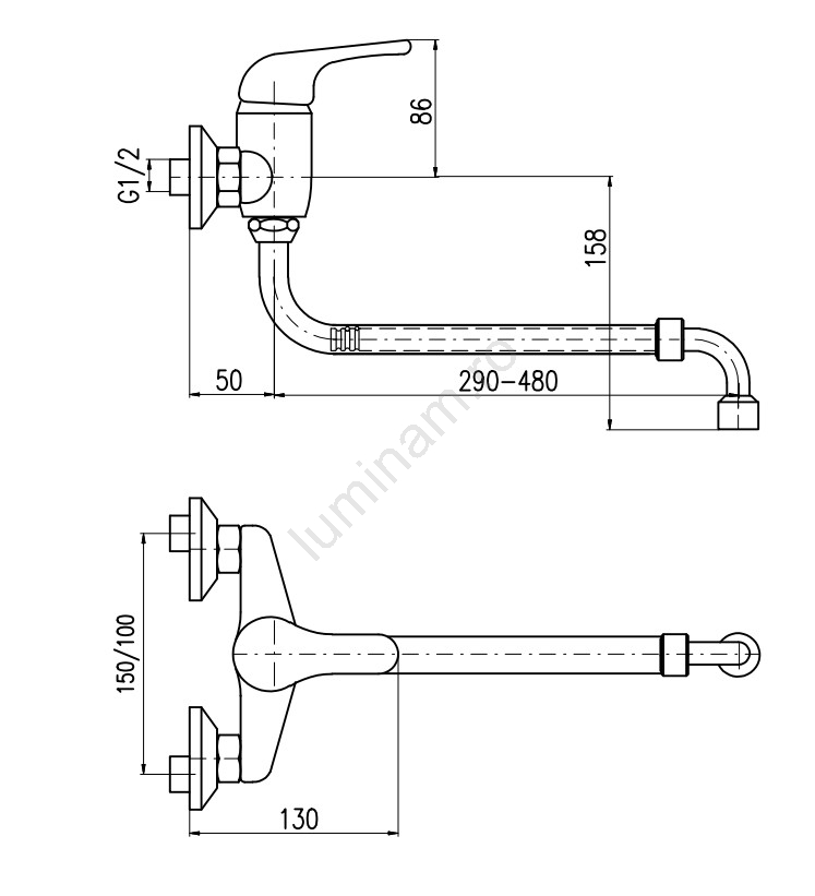 • Baterie de chiuvetă montată pe perete cu braț telescopic rotund