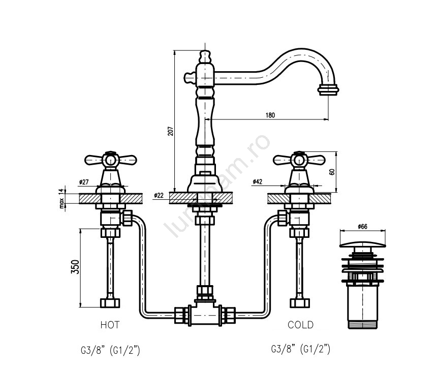 • Baterie monocomandă pentru lavoar, montată pe chiuvetă, cu pipa rotativă și sistem de scurgere CLICK-CLACK 5/4".