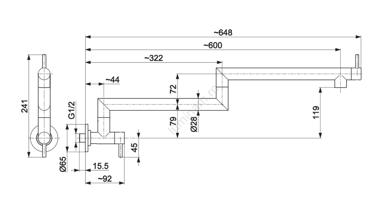 • Lungime maximă a brațului robinetului: 60 cm.