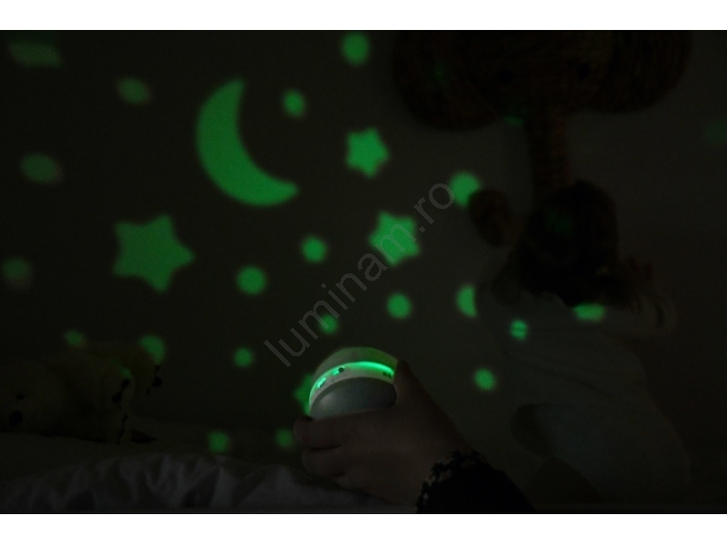 • Senzorul de plâns activează automat proiectorul la detectarea plânsului, pornind lumina roșie și muzica.
