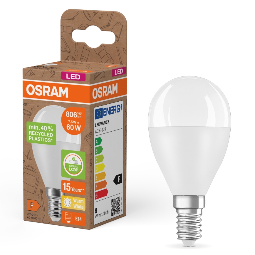 Bec LED P45 din plastic reciclat, soclu E14, 7,5 W, 230 V, 2700 K - Osram