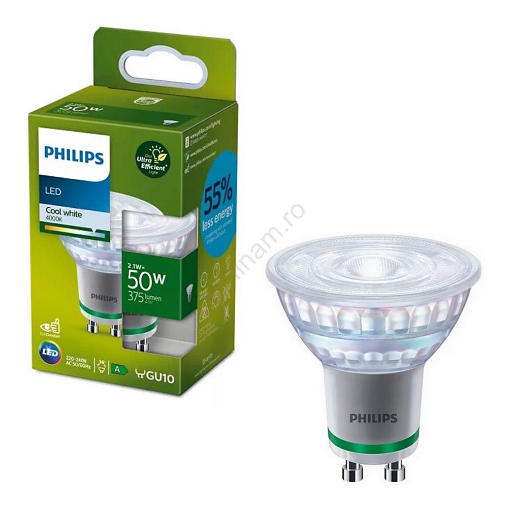 • Bec LED Philips ULTRAEFFICIENT PAR16 GU10, 2,1 W, 230 V, 4000 K