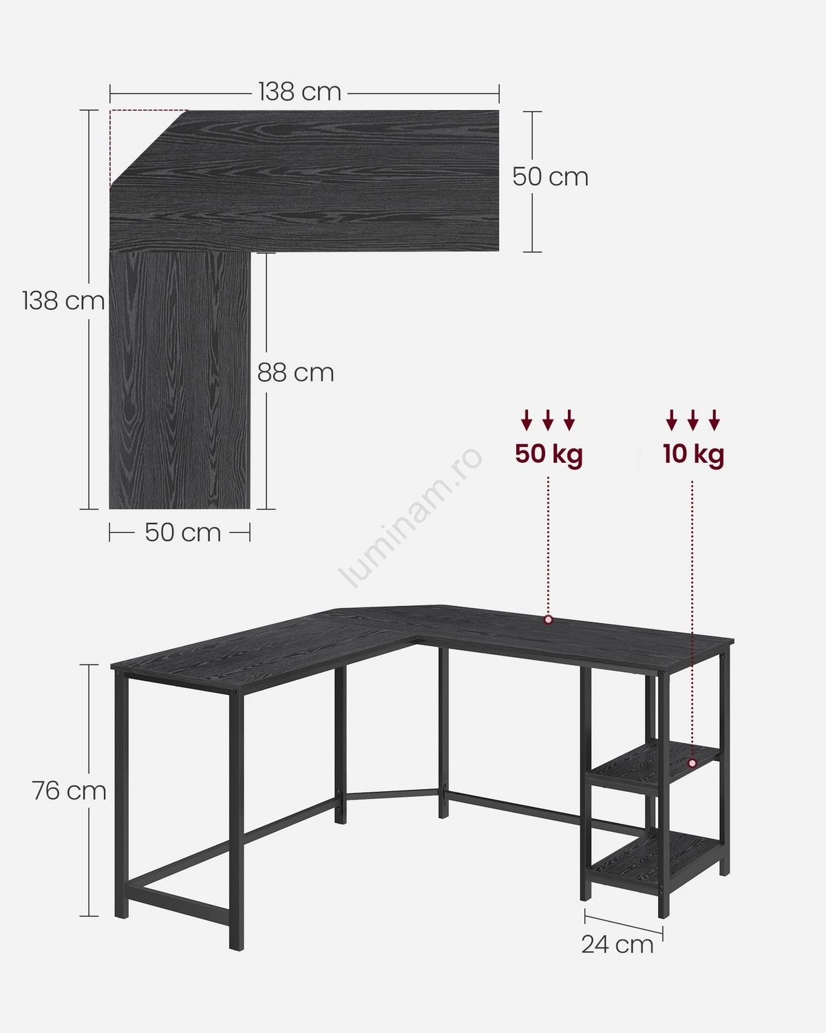 • Forma practică în L a acestui birou vă permite să valorificați optim spațiul din biroul sau din biroul de acasă.