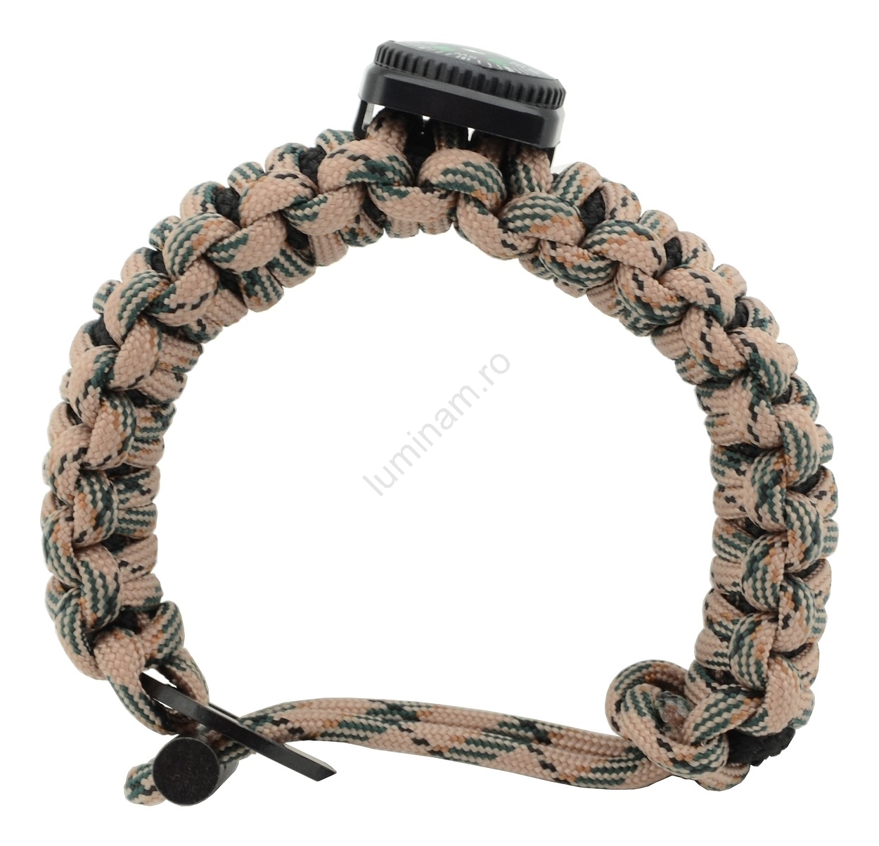 • Brățara este tricotată din paracord într-un model de cobră care poate fi complet desfăcut și folosit ca o frânghie în caz de urgență.