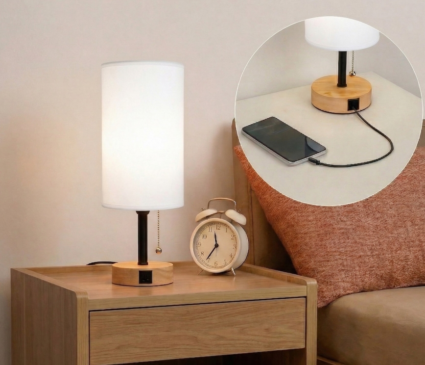 • Brilagi - Lampă de masă TABLON cu port USB 1xE27/25W/230V stejar/bej