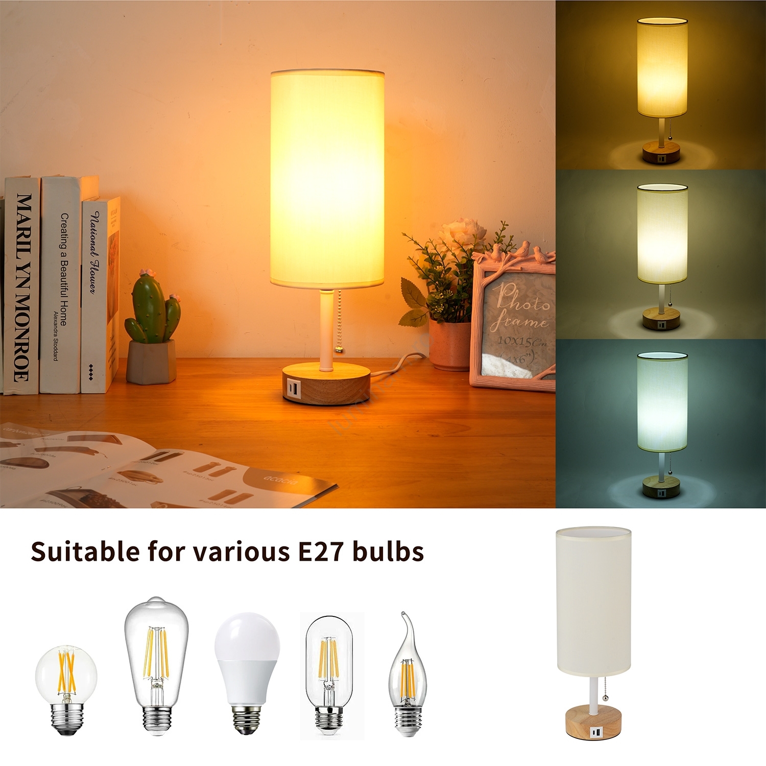 Brilagi - Lampă de masă TABLON cu port USB, 1xE27/25W/230V, stejar/alb/crem