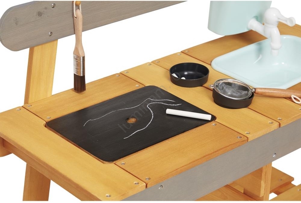 • Bucătăria de joacă din lemn pentru grădină stimulează creativitatea și sensibilitatea față de natură și oferă o mulțime de distracție în aer liber.