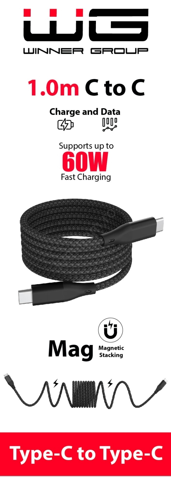 Cablu USB magnetic Winner Group USB-C/USB-C 1m 60W negru