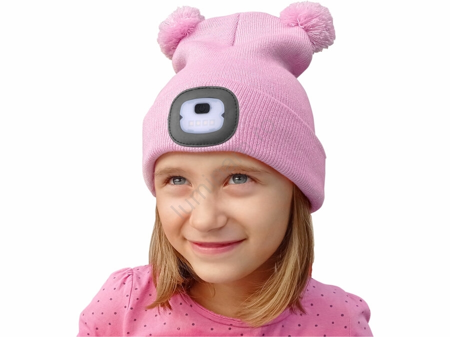 Căciulă cu lanternă frontală și încărcare USB 250 mAh roz cu ciucuri mărime pentru copii Extol