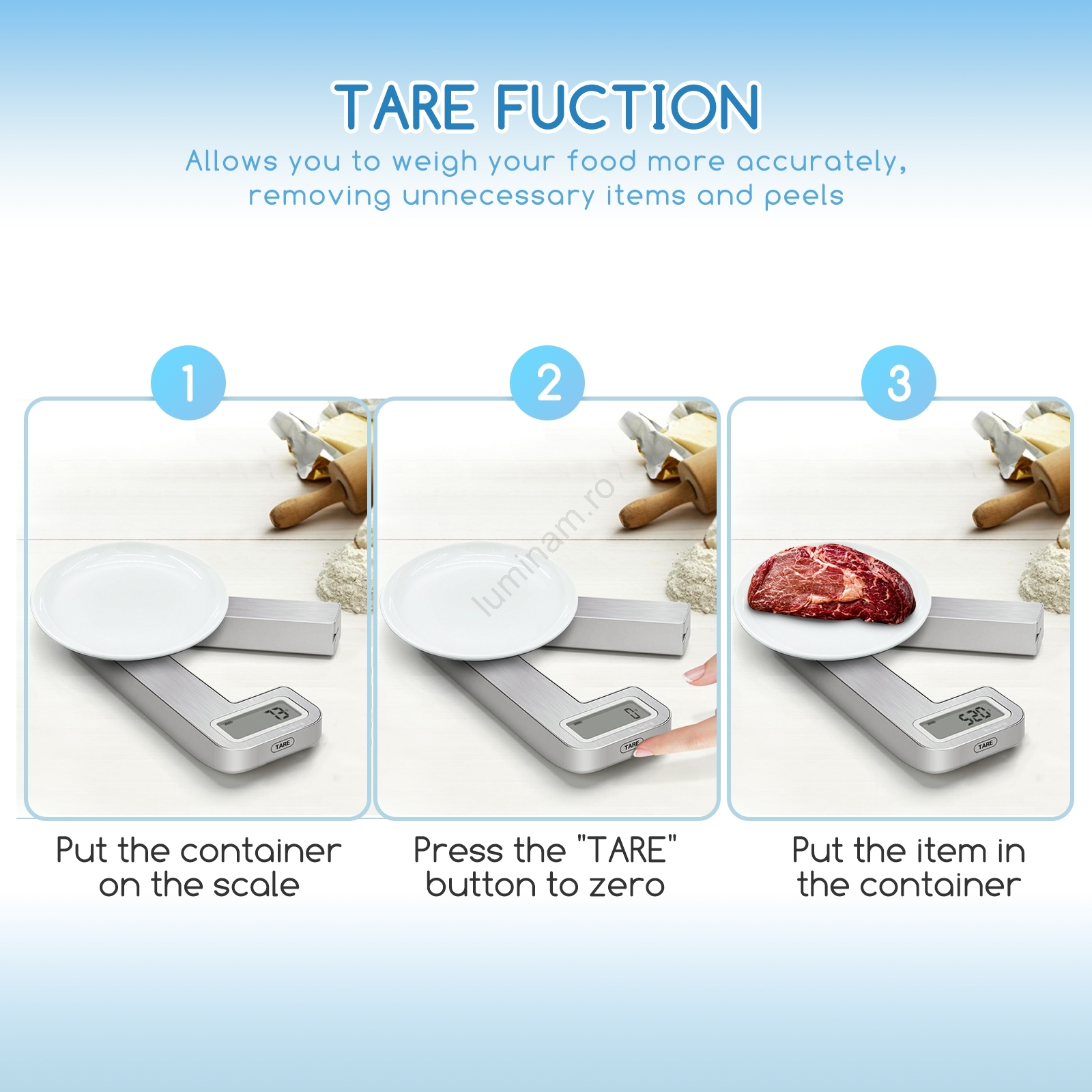 • Structura cântarului permite cântărirea mâncării direct din farfurie.