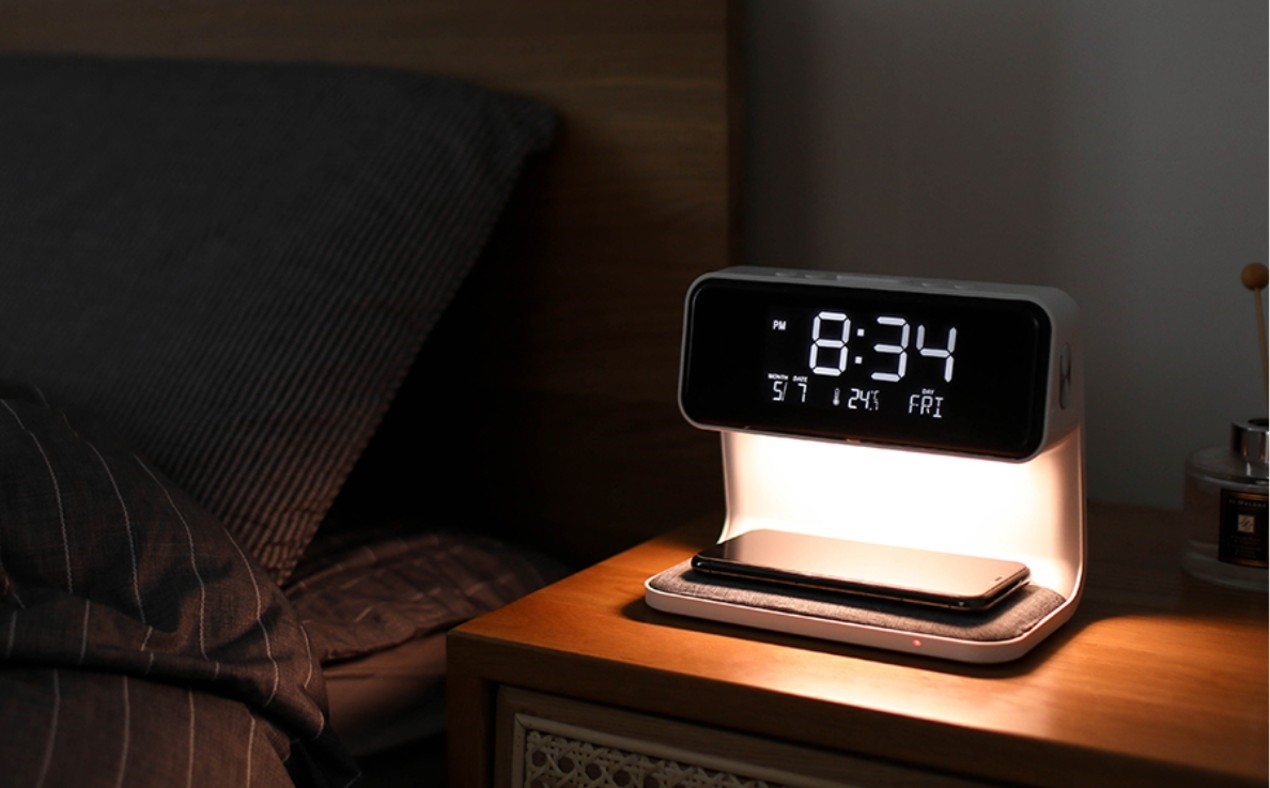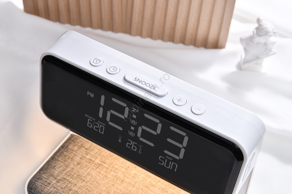 • Deșteptător electronic cu lumină de veghe și încărcător fără fir Qi încorporat pentru încărcarea dispozitivelor mobile.
