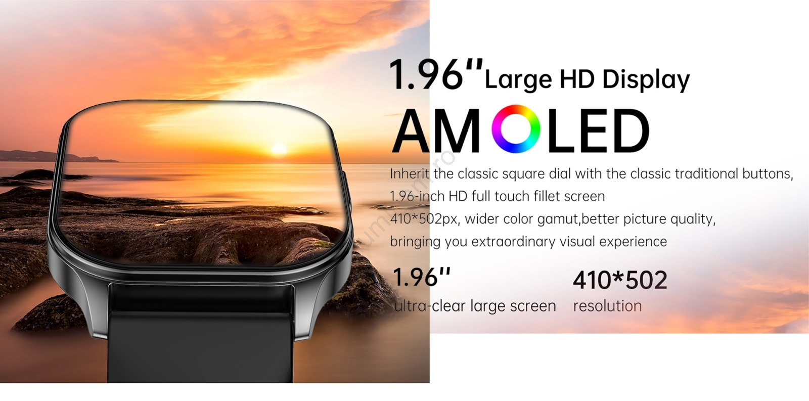 • Cadranul dreptunghiular cu un buton clasic îi conferă un aspect elegant, iar ecranul HD de 1,96 inch oferă o calitate excelentă a imaginii, permițându-vă să citiți cu ușurință și confort notificările aplicațiilor sau mesajele text.