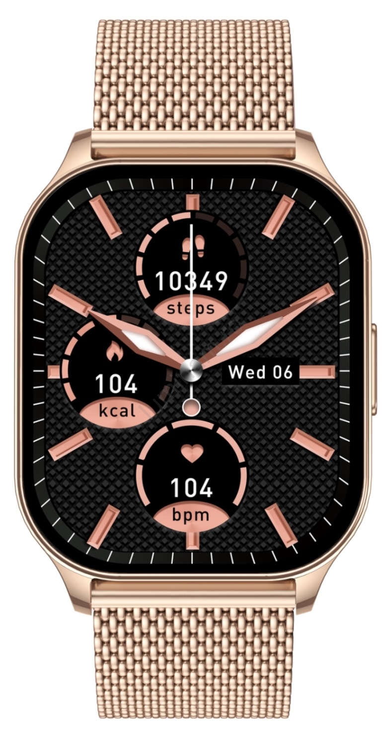 • Setul conține: SmartWatch WG AirFlexOne+, curea aurie, kit pentru scurtarea curelei, curea din silicon roz, cablu de încărcare dedicat.