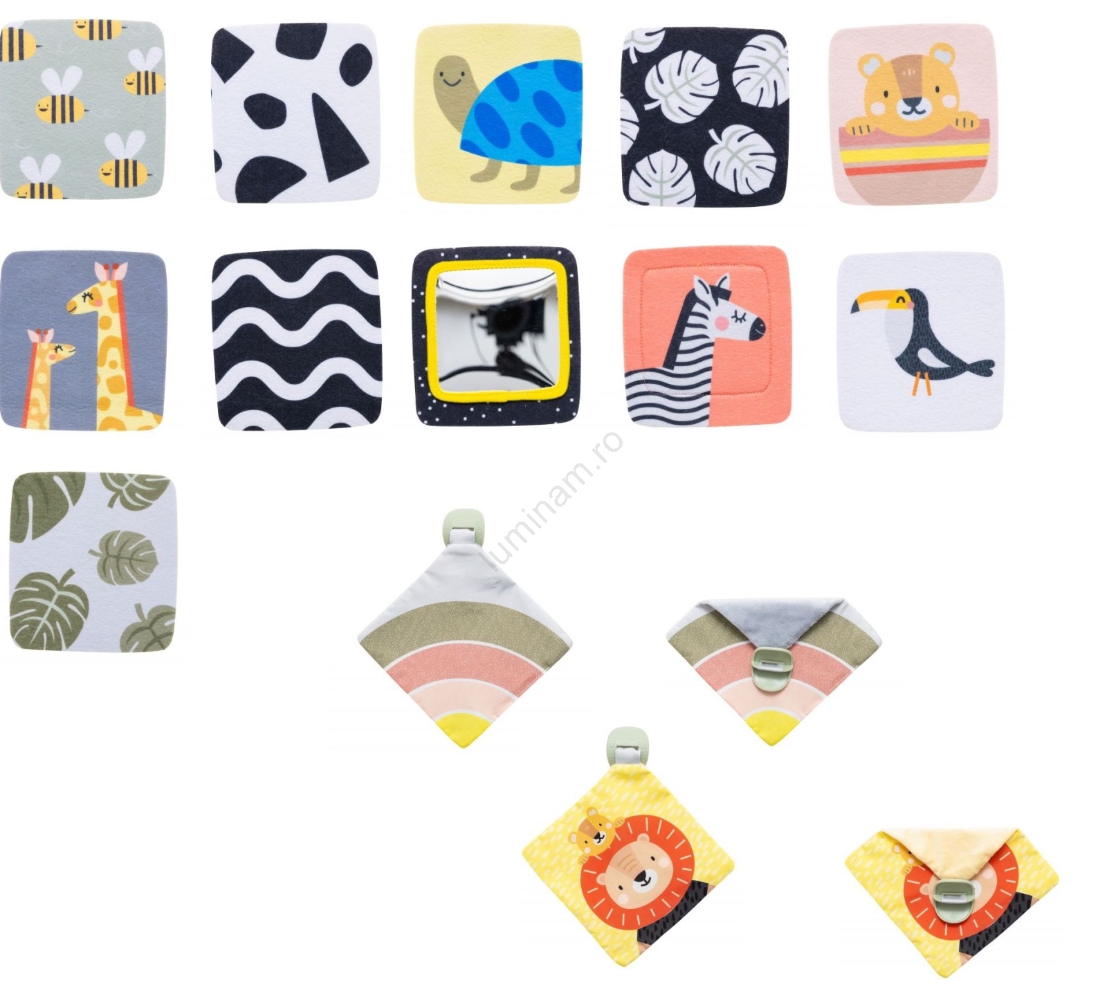 • Pentru bebelușii începând cu vârsta de 3 luni, există imagini în culori îndrăznețe și două pătrățele din țesătură care foșnesc, cu imagini și texturi diferite de explorat.