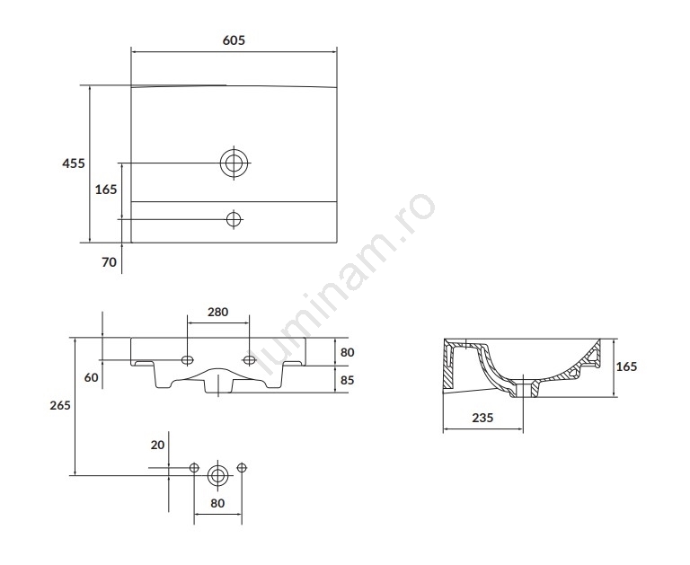 • Bateria pentru lavoar și ventilul de scurgere nu sunt incluse în pachet.