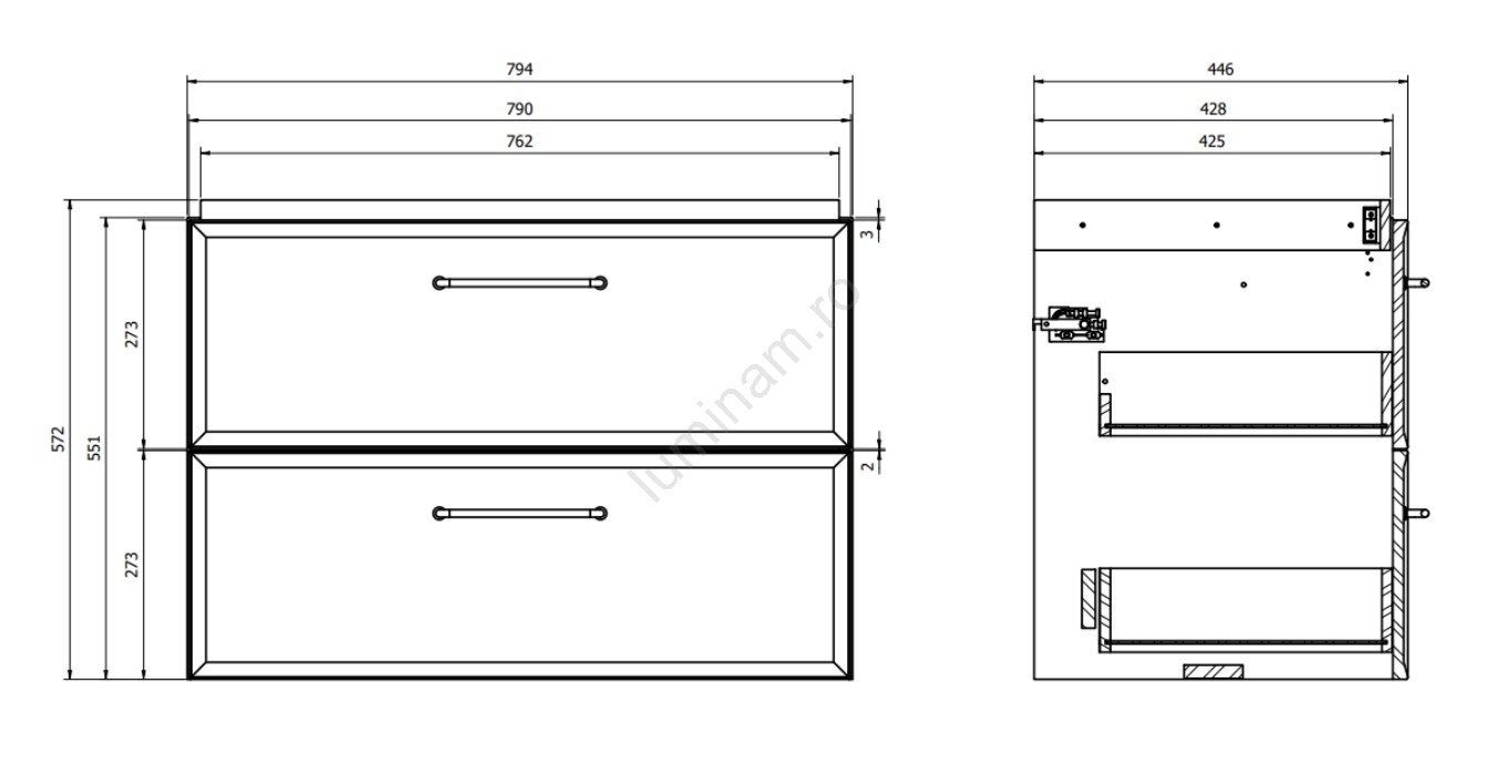 • Dulapul are două sertare spațioase cu închidere amortizată.
