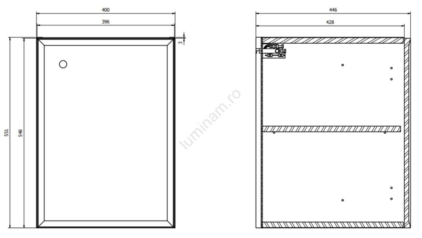 • Frontul, corpul și polița interioară sunt realizate din PAL de 16 mm cu lac negru mat.