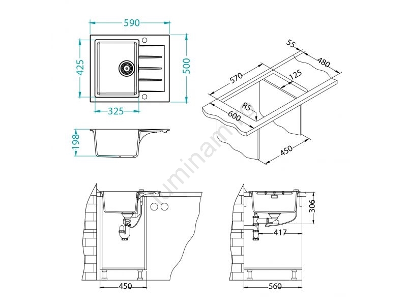 • Pachetul include: chiuvetă din granit, cleme pentru montare, ventil 3 1/2 cu sită, sifon pentru chiuvetă cu racord pentru mașina de spălat vase și comandă excentrică pentru scurgere.