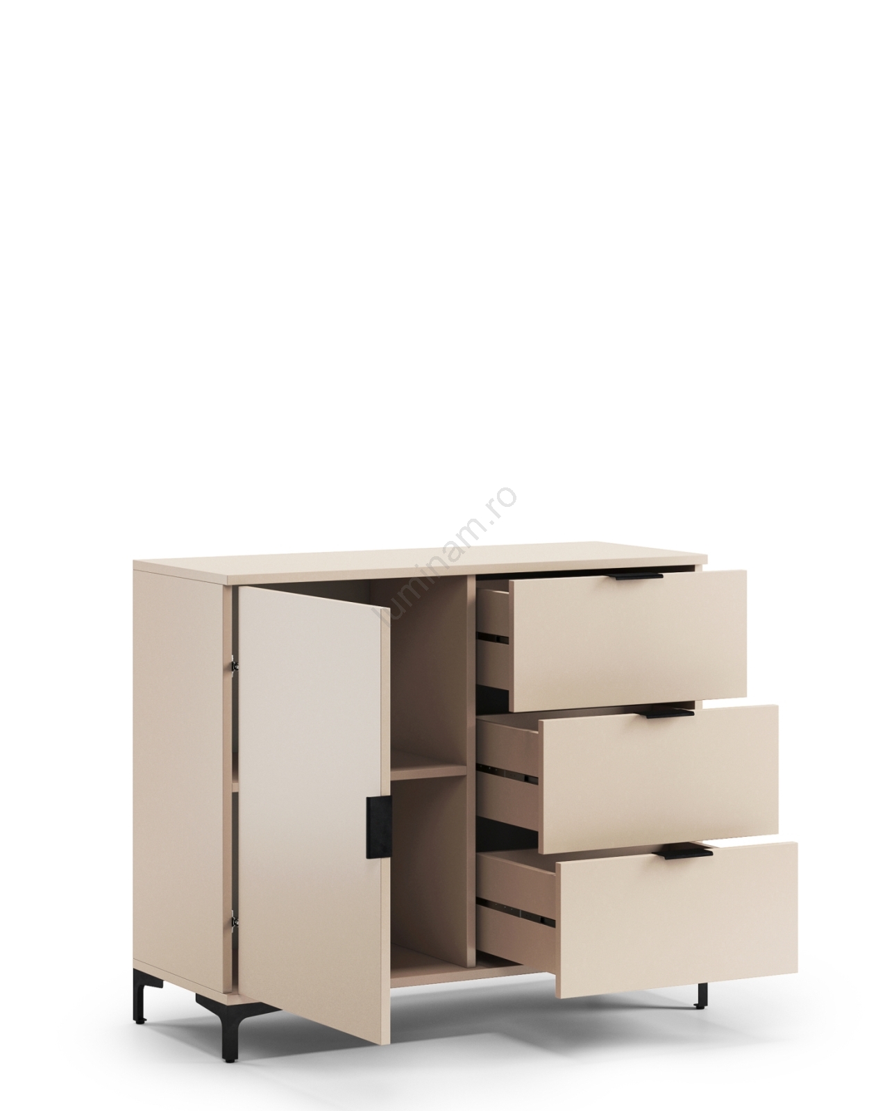 • Mobilierul este realizat în stil loft, cu picioare și mânere din metal, care îi conferă un aer industrial distinct.