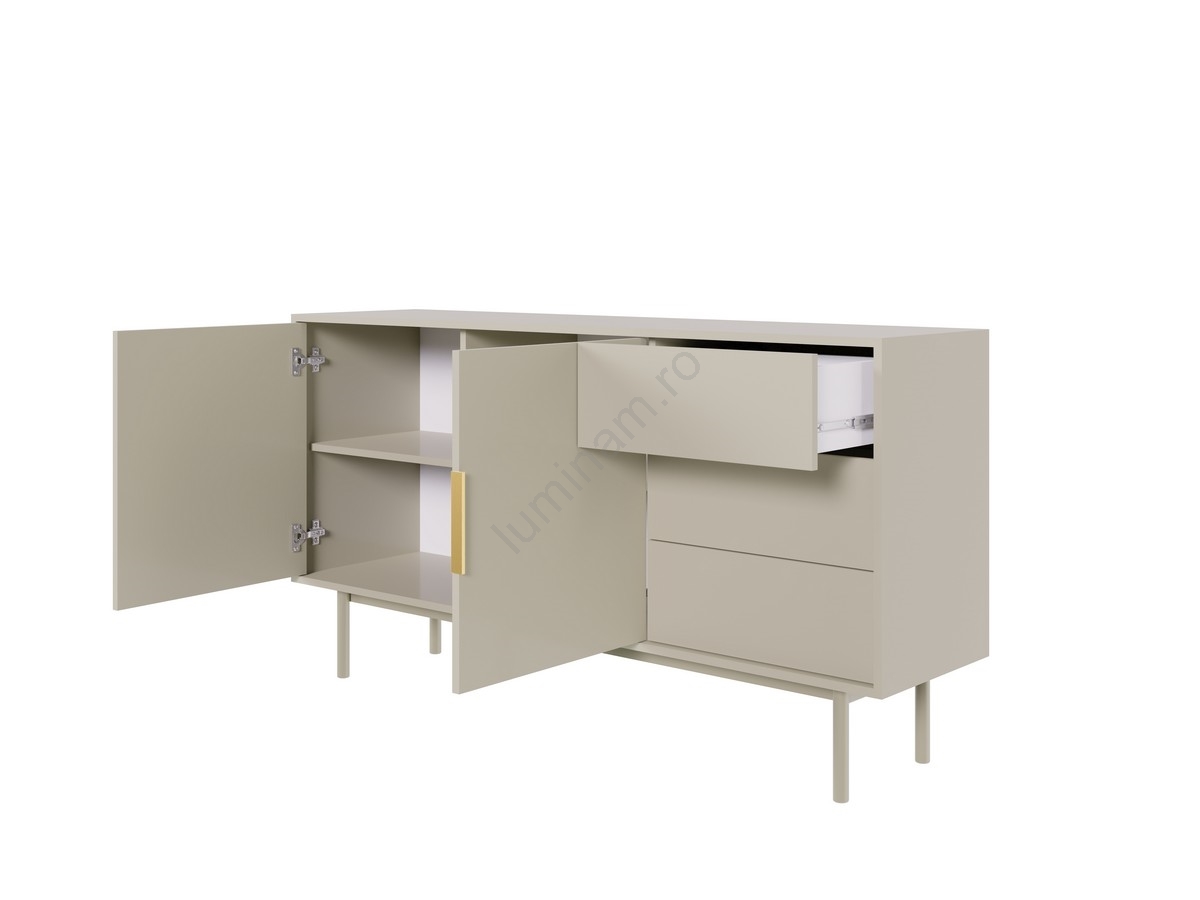 • Dispune de două uși în partea stângă și trei sertare în partea dreaptă, pentru depozitare ordonată.