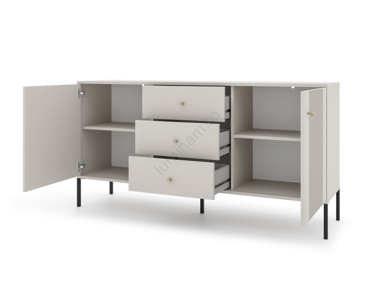 • Are trei sertare centrale și două polițe cu uși, prevăzute cu caneluri verticale.