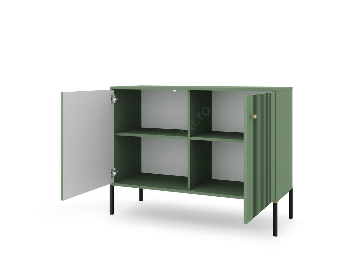 • Dispune de două polițe cu uși cu caneluri verticale.