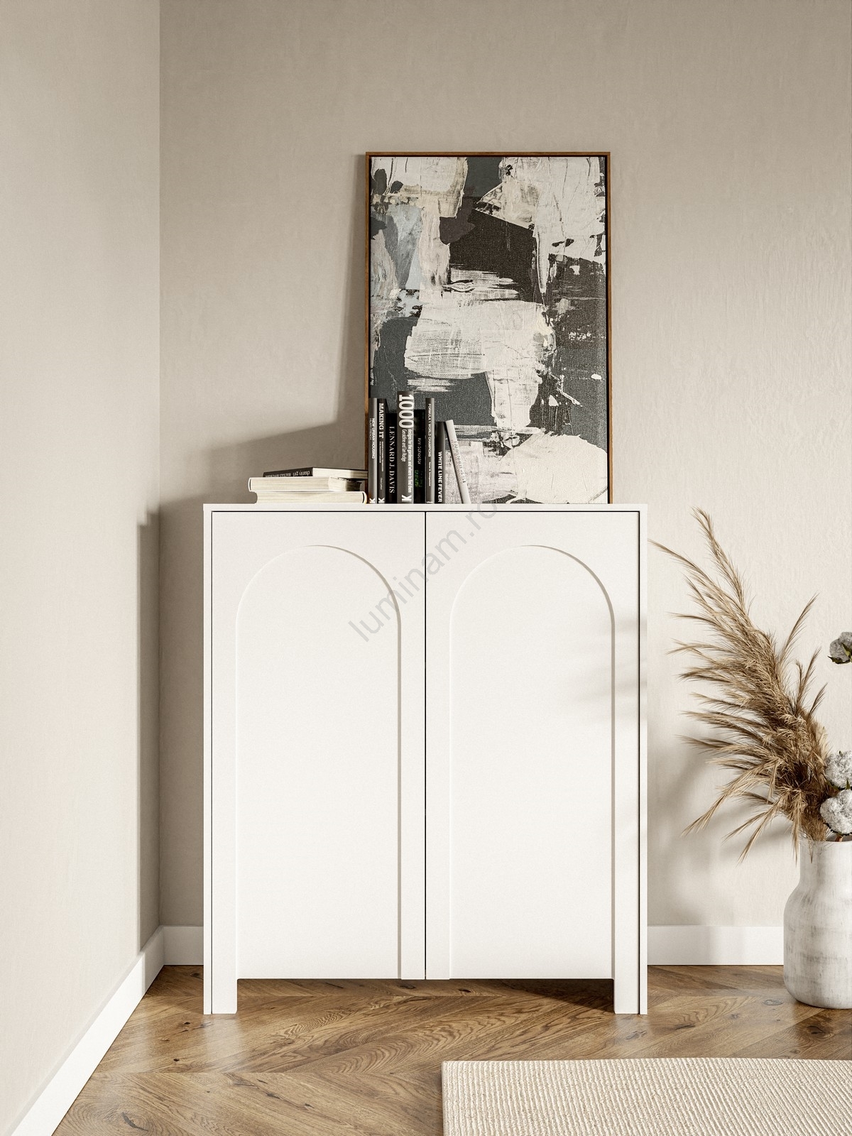 • Are două uși, fiecare decorată cu un model arcuat delicat pentru un efect vizual rafinat.