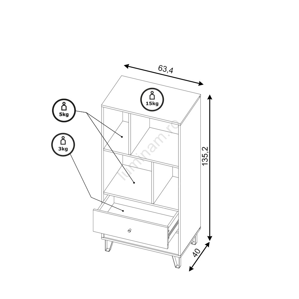 • Dispune de patru rafturi deschise și două sertare pentru depozitare organizată.