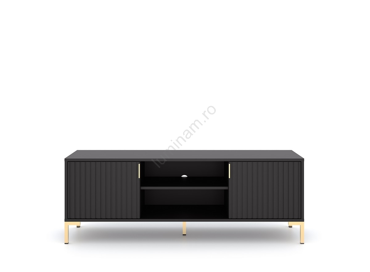 • Dispune de două compartimente laterale închise, fiecare cu ușă și mânere simetrice, cu caneluri, și de două rafturi deschise cu orificiu pentru cablu în partea centrală.