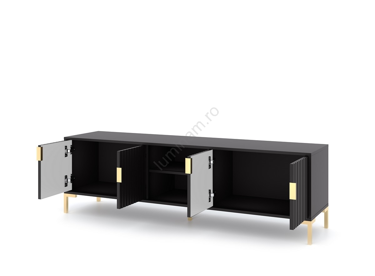 • Dispune de două compartimente laterale închise, fiecare cu câte două uși prevăzute cu mânere simetrice, cu detaliu canelat, și două rafturi deschise cu orificiu pentru cablu în mijloc.