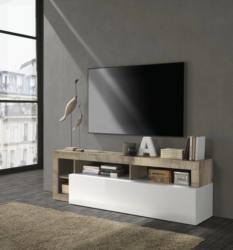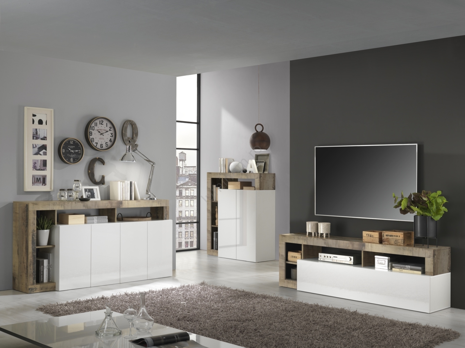 • Comodă TV LENOR, alb/gri cu aspect beton