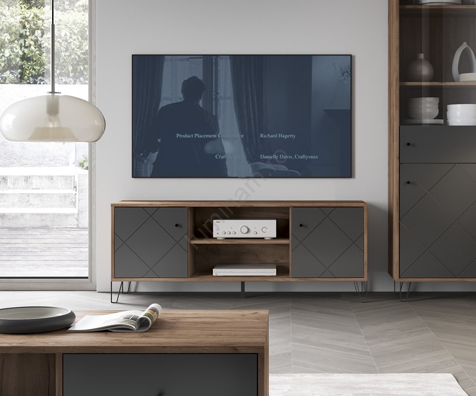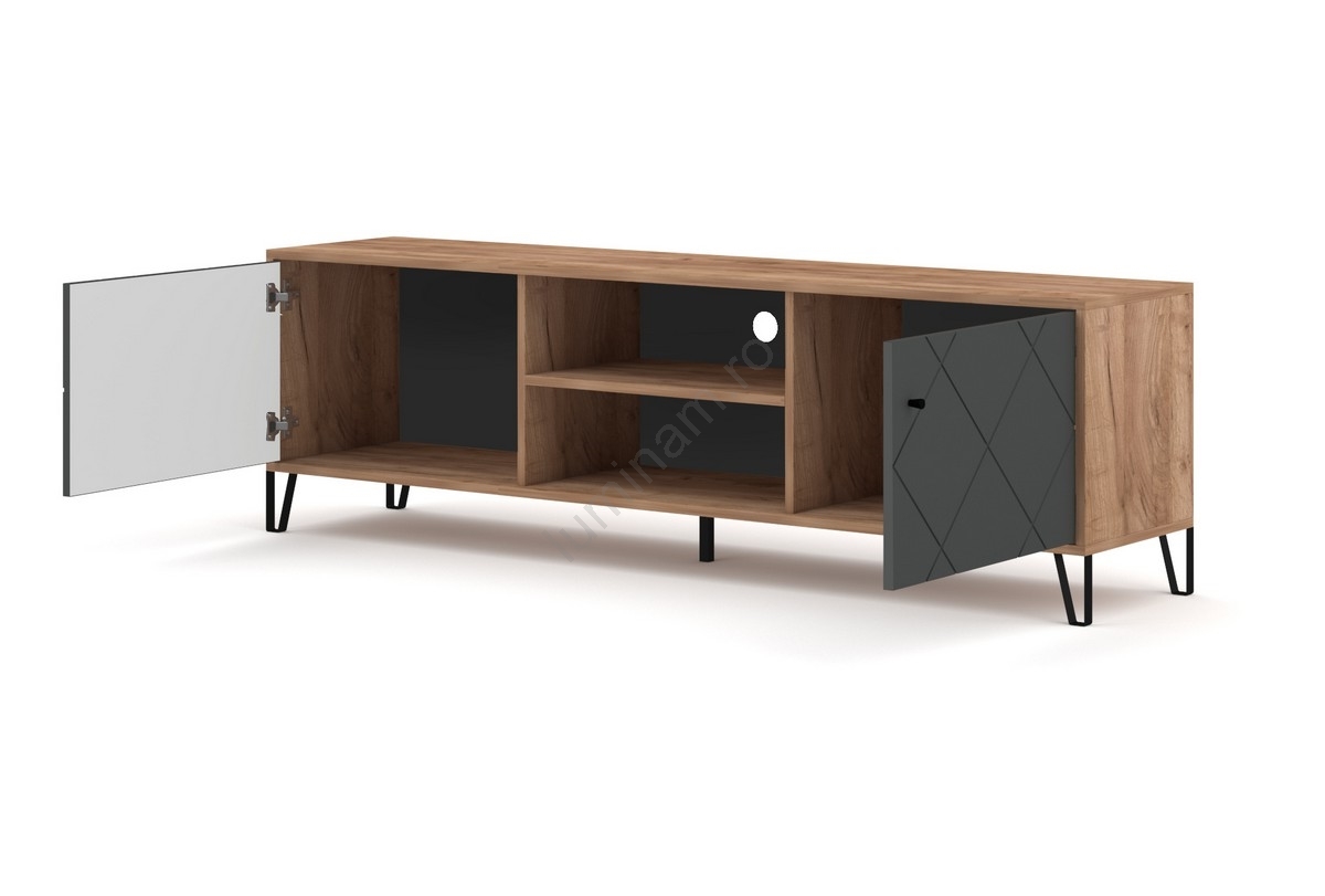 • Are două compartimente laterale închise, fiecare cu ușă decorată diagonal, și două rafturi deschise, cu orificiu pentru cablu în partea centrală.