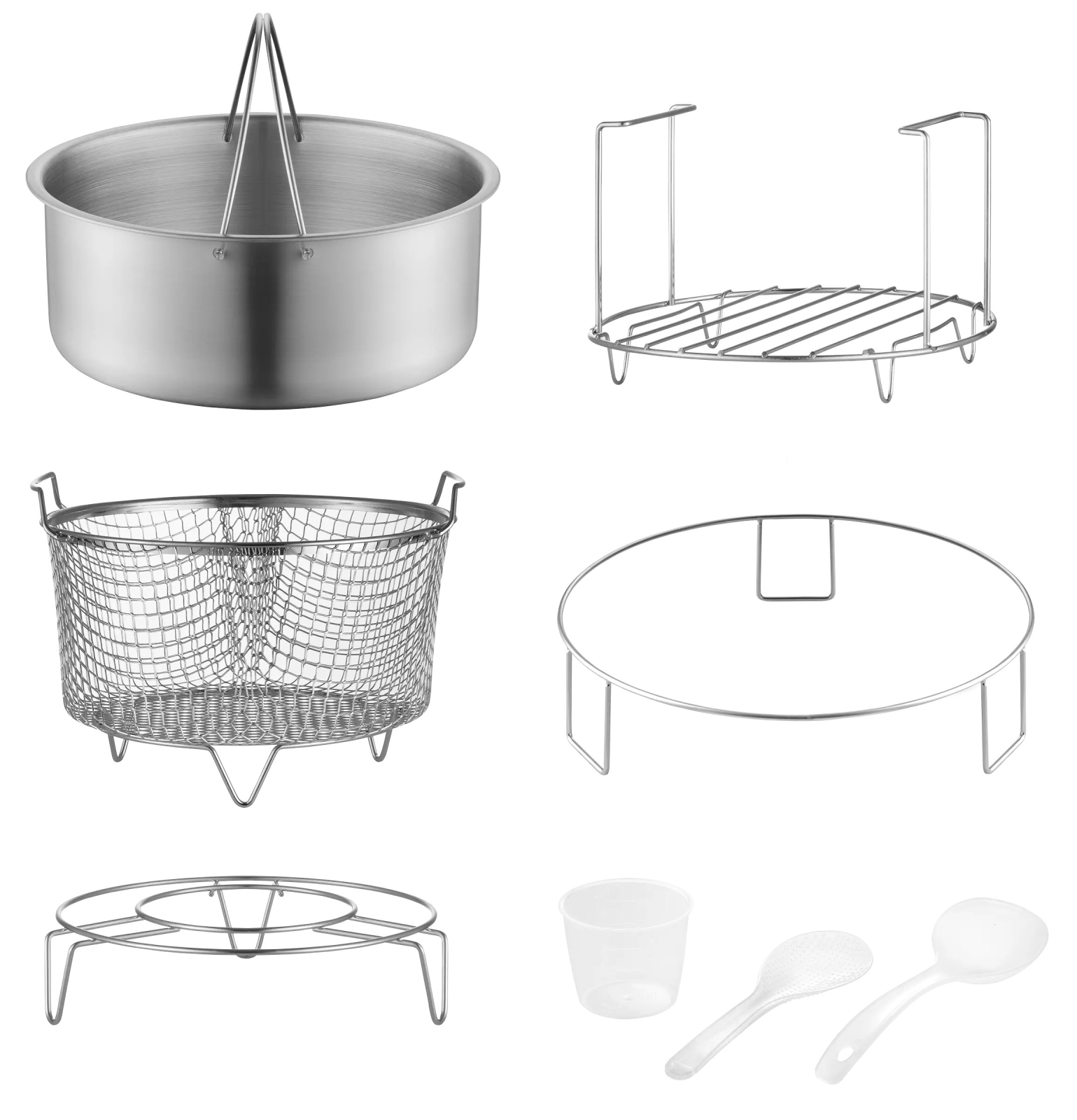 • Accesorii: coş pentru prăjit 3,5 l, suport pentru capace, oală pentru aburi, suport pentru gătit la abur, tavă pentru grătar, cupă de măsurare (pentru orez), lingură din plastic (puţin adâncă), polonic din plastic, recipient colector pentru condens (apă în exces).