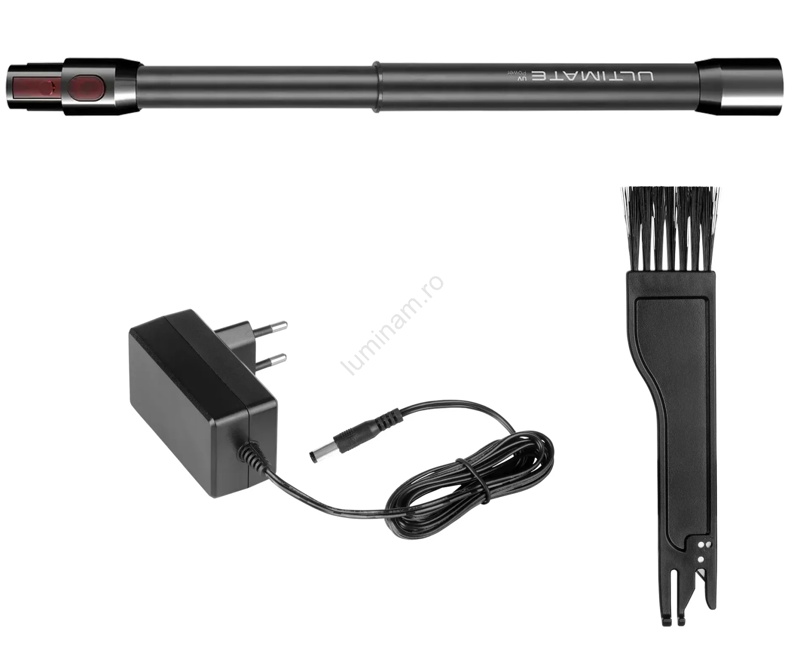 • Accesorii în pachet: Extensie flexibilă în partea superioară a aspiratorului, perie turbo mică UVC, peria HardFloor, peria Carpet, furtun flexibil, duză pentru spații înguste, duză pentru spații înguste cu perie, duză pentru tapițerie, adaptor de alimentare.