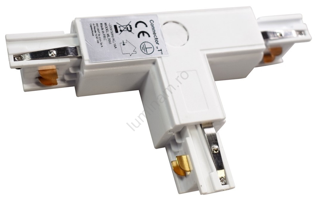 Conector trifazic pentru corpuri de iluminat în sistem pe șină TRACK alb tip T