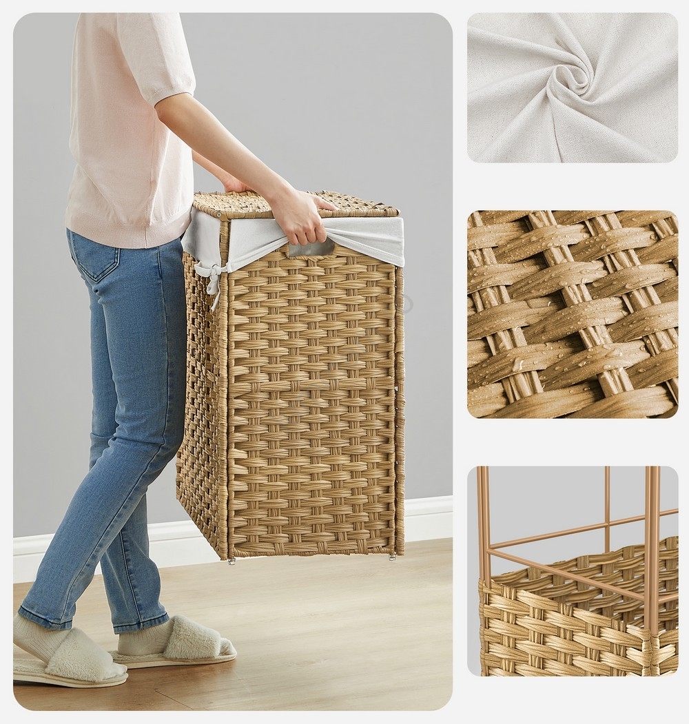 • Confecționat manual, țesut cu atenție din ratan sintetic, acest coș de rufe este piesa lipsă pentru a ascunde rufele murdare și a menține ordinea perfectă în locuința dumneavoastră.