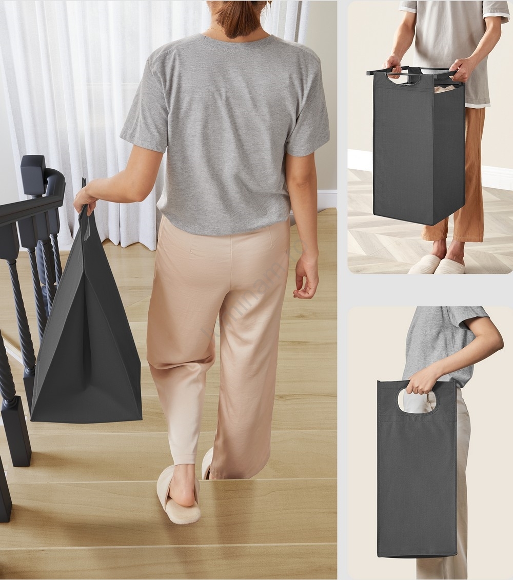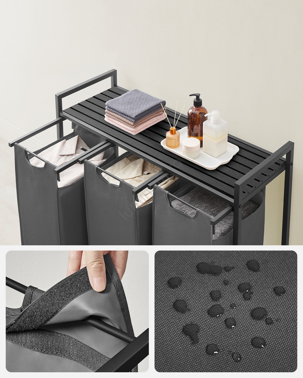 • 3 saci, 1 raft – Împărțiți rufele în trei saci din material textil (38 l pe sac) și depozitați detergenții, balsamul și alte produse pe raft.