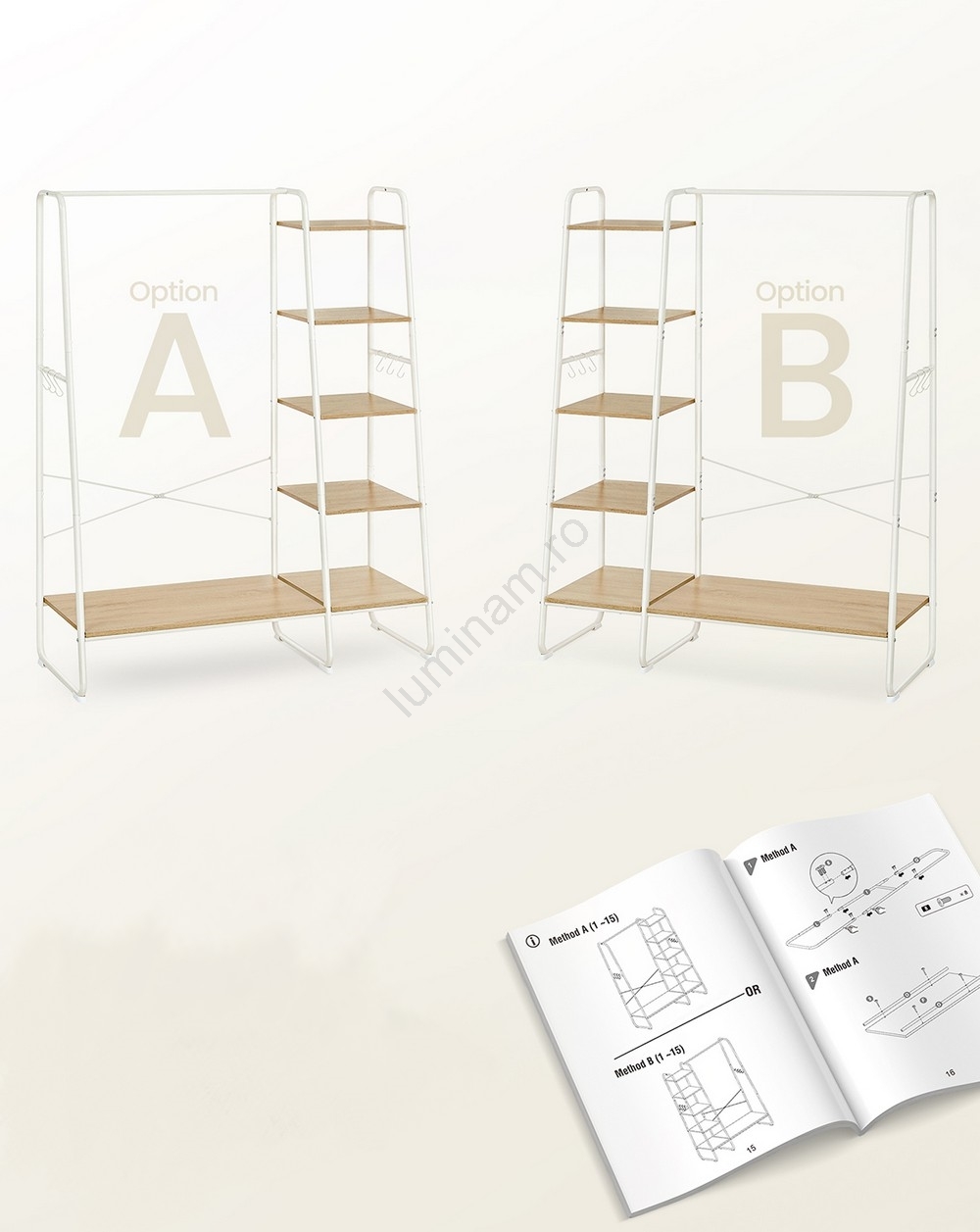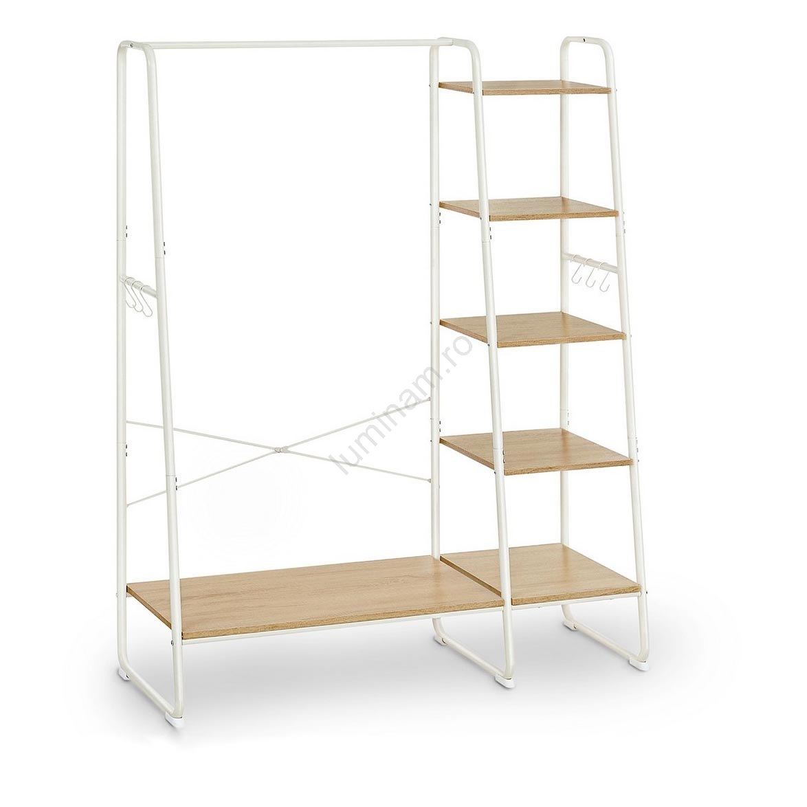 • Agăţaţi jachetele, cămășile şi pantalonii pe bara superioară pe toată lungimea, iar pe cele 6 poliţe de depozitare puneţi genţi, încălţăminte, cutii,  pălării, eşarfe, umbrele şi alte obiecte necesare.