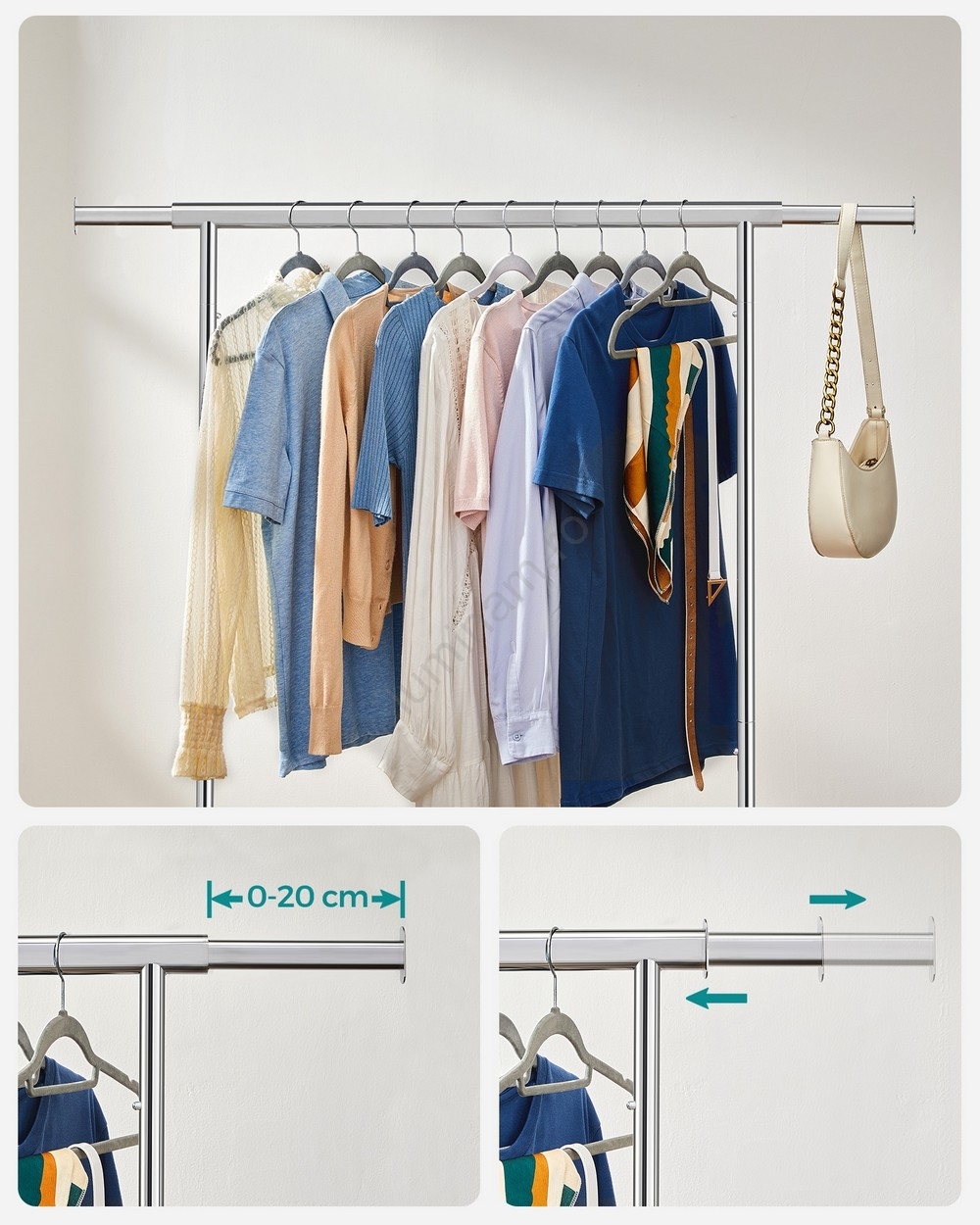 • Bară superioară suportă până la 90 kg (încărcare uniformă) fără balansare sau răsturnare; bara extensibilă oferă spațiu suplimentar pentru haine, pălării, genți etc.