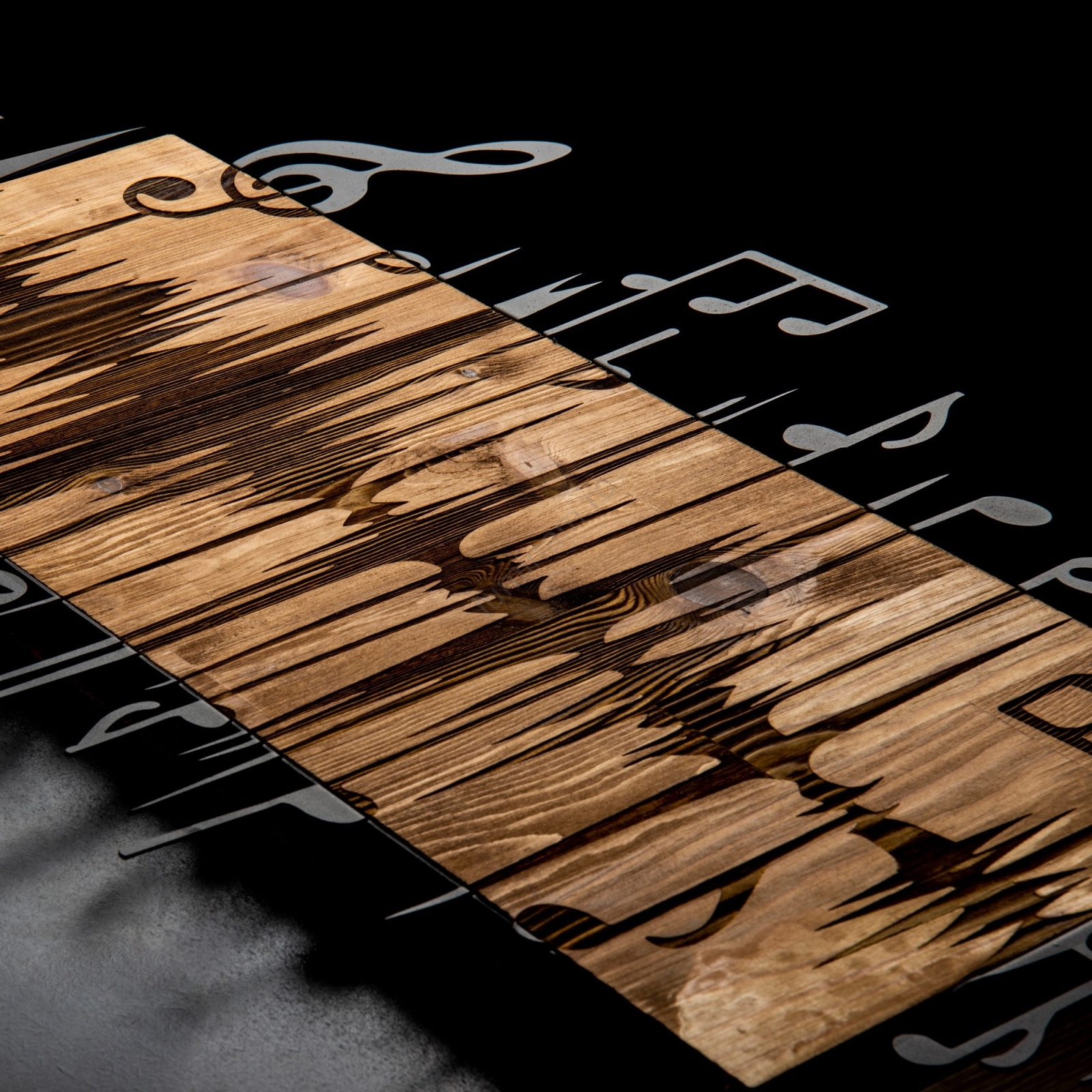 • Motivul de pe lemn este gravat cu laserul, iar piesele metalice sunt fixate de lemn.