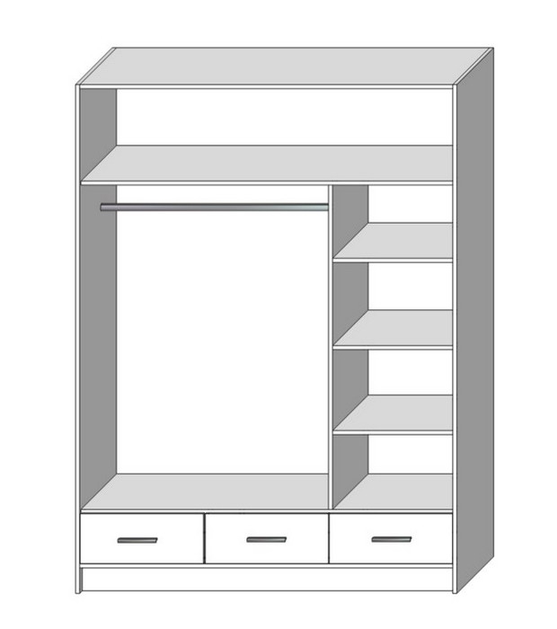 • Dulapul dispune de 4 rafturi deschise, 3 sertare, o bară pentru umerașe și un raft superior pentru depozitarea genților și a obiectelor sezoniere.
