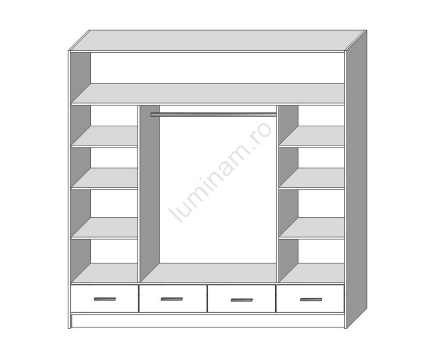 • Dulapul dispune de 8 rafturi deschise, 4 sertare, o bară pentru umerașe și un raft superior pentru depozitarea genților și a obiectelor sezoniere.