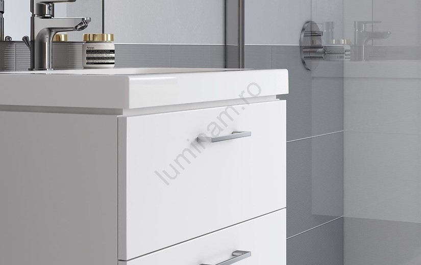 • Dulapul are două sertare spațioase cu deschidere amortizată și mânere cromate.