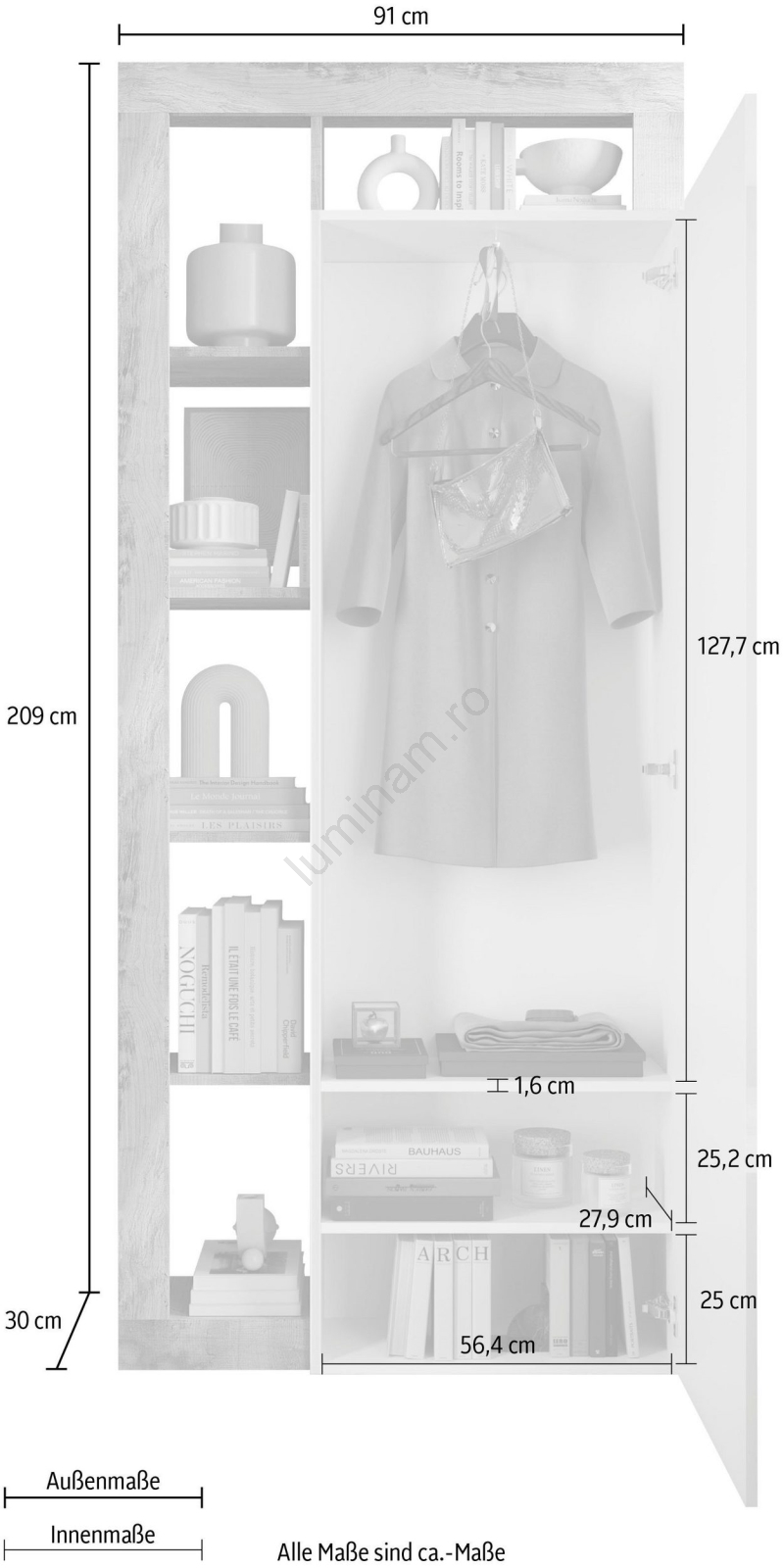 • Dulapul dispune de 6 rafturi deschise, o bară pentru haine și 2 rafturi interioare pentru depozitarea genților și a articolelor sezoniere.