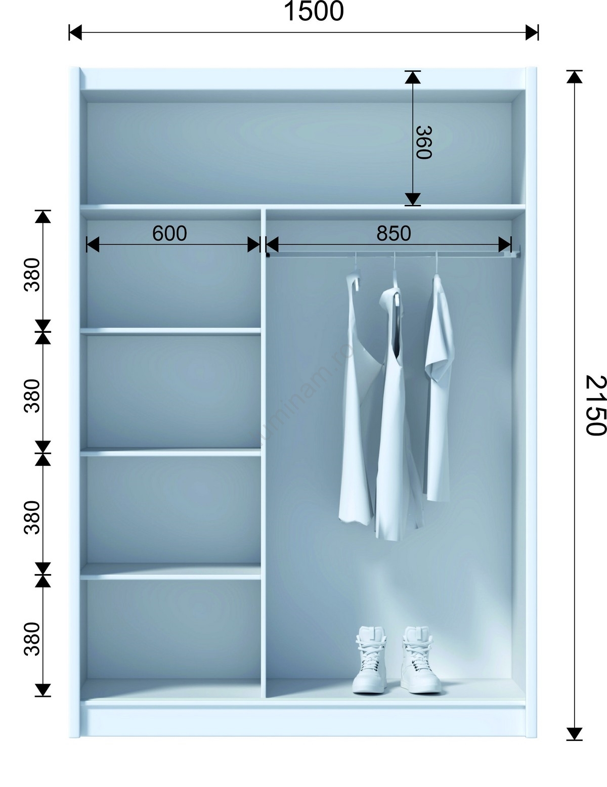 • Dulapul dispune de 4 rafturi deschise, o bară pentru umerașe și un raft superior pentru depozitarea genților și a obiectelor sezoniere.