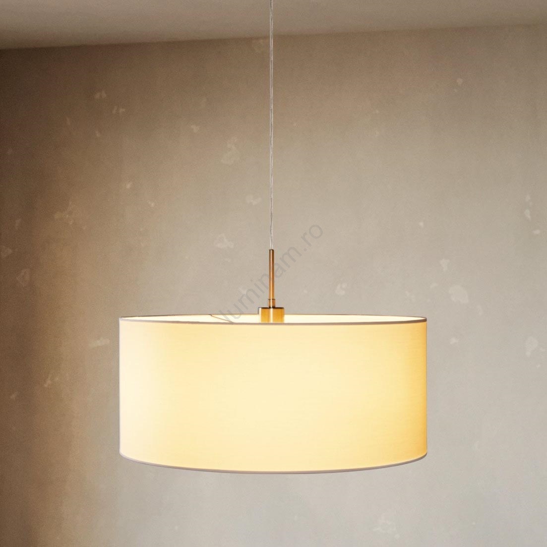 • Aspectul corpului de iluminat este subliniat de un abajur fabricat dintr-un material textil de culoare albă, completat cu un suport din metal.